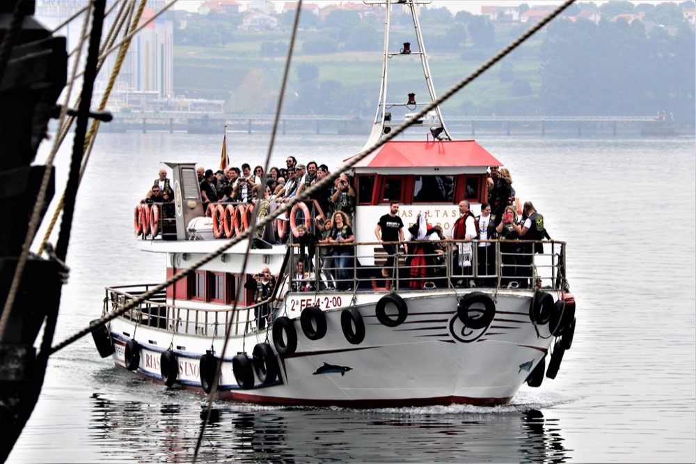 El sábado, una vez desayunados en los respectivos hoteles, se inicia con la salida programada. Nos acompaña la Policía Local por las calles de la ciudad hasta llegar al puerto ferrolano. Por su parte, la Policía Portuaria nos tenía reservado el aparcamiento justo enfrente al punto de embarque, y dónde, además, se encontraba atracada la réplica de la nao Victoria. Espectacular.